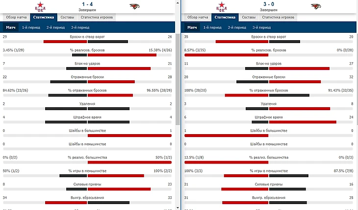 По цифрам наглядно видно, как Авангард терпит на протяжении всей серии. 48 заблокированных за 2 игры - дорогого стоит. Вопрос в том, на сколько хватит самоотдачи ребят, ведь играют люди, а не роботы. Роботы, скорее, ЦСКА, которые штамповали броски на протяжении всего второго матча. Такой хоккей очень затратный в плане физики и вполне вероятно, что дальше будет чуть меньше силовой борьбы (но это не точно).
