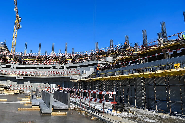 В апреле 2021-го в конструкциях уже узнаются трибуны и подтрибунные помещения, а дворец вырос до четвертого этажа.