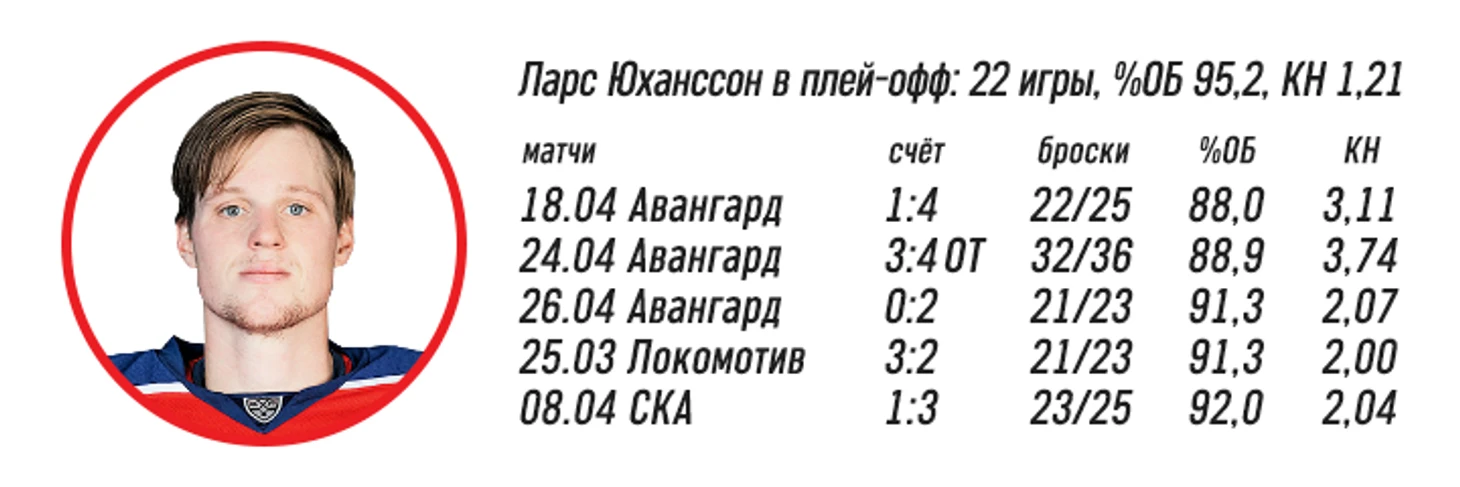 С нагрузкой голкипер справился, путь до финала получился близким к идеальному. Без провалов, на его счету был всего один матч с процентом отражённых бросков ниже 92. Юханссон не пропускал больше двух шайб в основное время, да и третью в воротах увидел лишь раз – посередине шестого периода игры против СКА.