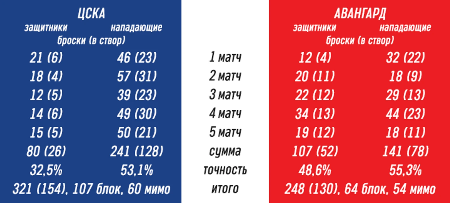 Защитники «Авангарда», начиная со второго матча, наносят более десяти бросков в створ ворот. У игроков обороны ЦСКА попаданий в створ в два раза меньше и точность заметно ниже. С нападающими всё наоборот, армейцы имеют на сто бросков больше, пятьдесят из которых пришлись в створ.