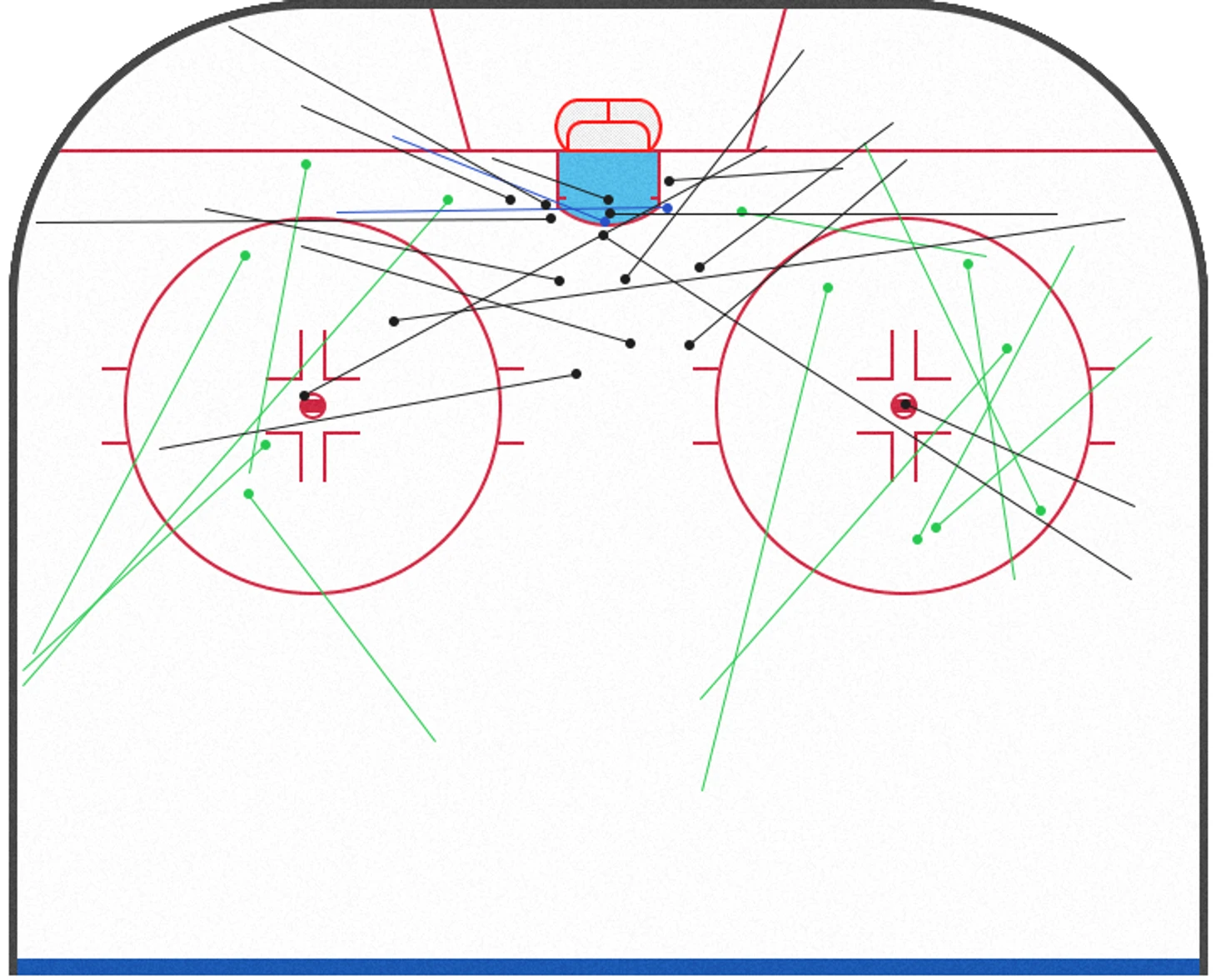 Показаны передачи игроков ЦСКА в равных составах на ближней к воротам «Авангарда» половине зоны, исключая пасы возле бортов. Точные передачи отмечены зелёным, чёрным – неточные.
