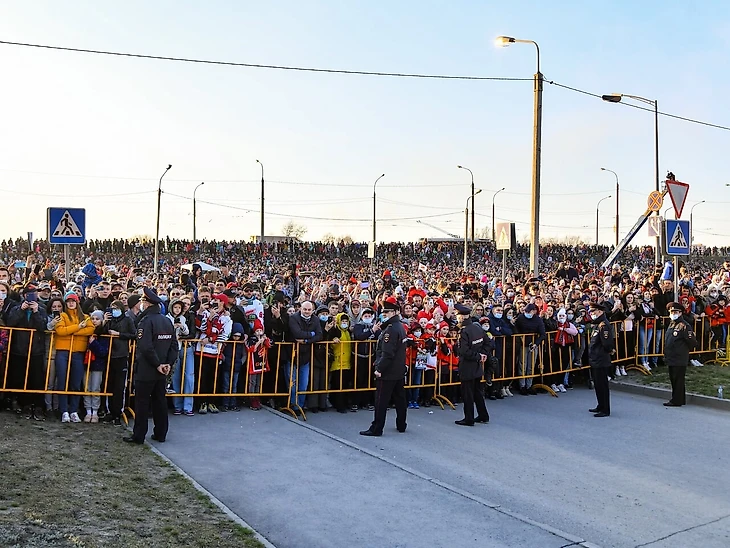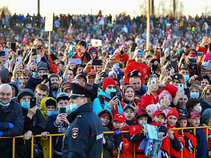 Разумеется, автобус «Авангарда» ехал в сопровождении спецмашин, а потому достаточно быстро добрался из аэропорта до места строящейся «Арены Омск». Там уже была собрана сцена для чествования команды – а болельщиков было еще больше! Несколько тысяч.