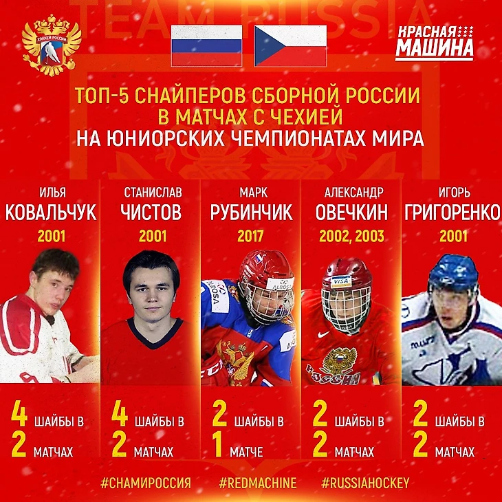 Учитывая предыдущий абзац, логично, что в лидерах по статистике против чешских сборных – игроки сборной-2001. На первом месте тут Илья «Я не верю своим глазам» Ковальчук – у него 4 шайбы в двух матчах (в одном был хет-трик). Больше трюков со шляпой никто не проворачивал, зато были дубли: у Станислава Чистова в золотом 2001 году (дважды!) и Марка Рубинчика в 2017-м (привет, Марк!).