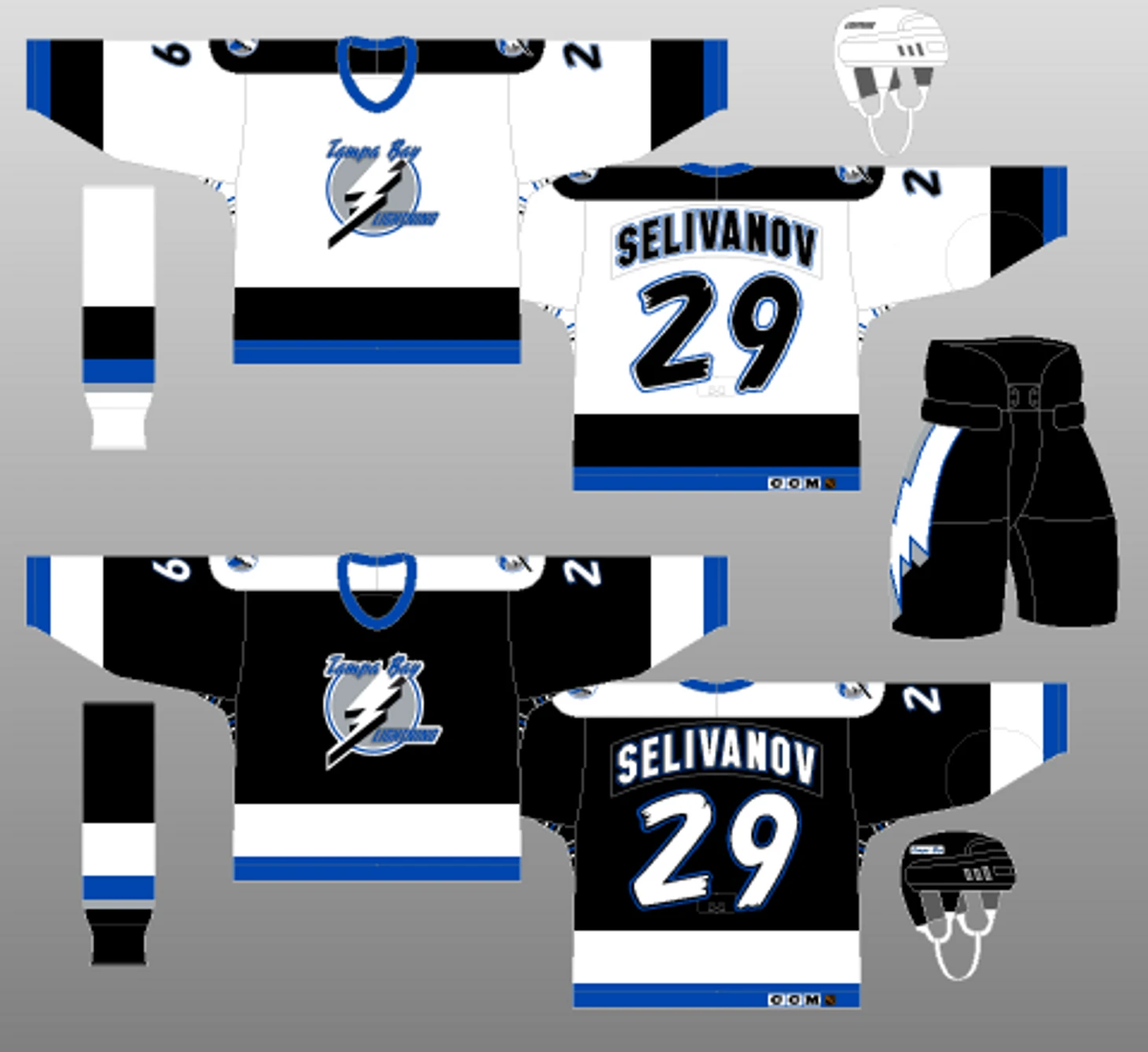 Если мы говорим, что молния-гроза - это стихия, то на данном джерси сразу несколько стихий. Это и дождь (диагональные росчерки по ливрее), это и шторм (нижняя часть джерси), это и пожар (отчётливо виден на рукавах фото Селиванова). Ещё одно "между прочим" - в первом домашнем матче плей-офф с "Филадельфией" в "Thunder Dome" на трибунах собралось 28183 (по другим данным 29675 и лично я склонен верить этому числу) зрителей. Рекорд для хоккейных матчей в закрытых помещениях и для матчей Кубка Стэнли. Саня (Сели) рассказывал, что хотели превысить 30, и возможности были, но кто-то умный заглянул в пожарные инструкции и сказал "одерживать", а на второй матч - вообще сказали "смайнаться" до 27. А в матче был назначен овертайм, и Селиваныч забил решающую.