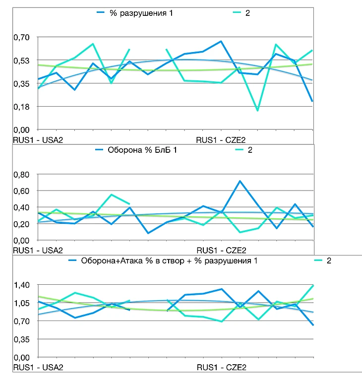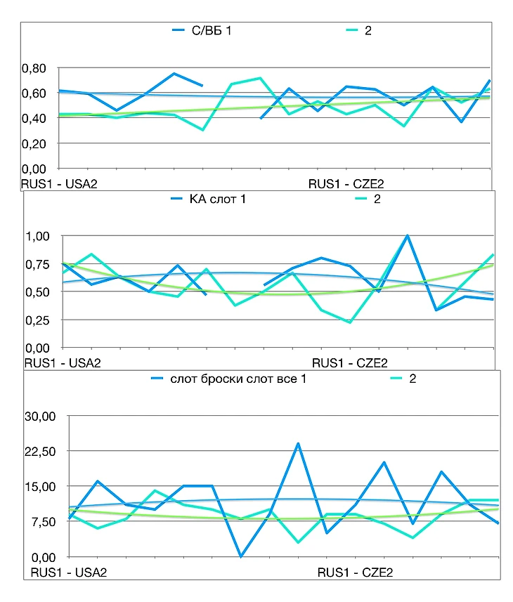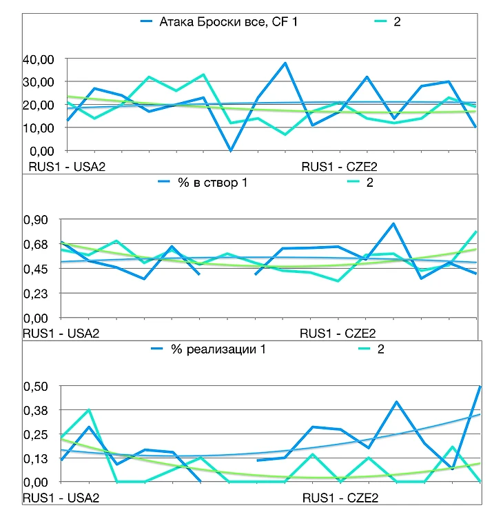 Сборная России прошла групповой этап и четвертьфинал ЮЧМ. Давайте взглянем, какими получились матчи. На графике мы видим точные результаты каждого периода, а также сглаженный тренд по каждому показателю. Россия обозначена синим цветом, соперник - зелёным.