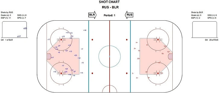 На турнирах IIHF предоставляется не только бросковая статистика, но и карта бросков. Что позволяет отдельно отследить попытки из слота. Любопытно, что форма самого слота может меняться в зависимости от турнира. Мы решили, что на ЮЧМ вратари еще не способны доминировать так, как это случается на молодежном и тем более взрослом уровне. Поэтому пространство слота решили сильно не ограничивать. Вот что получилось на примере матча Россия-Белоруссия: