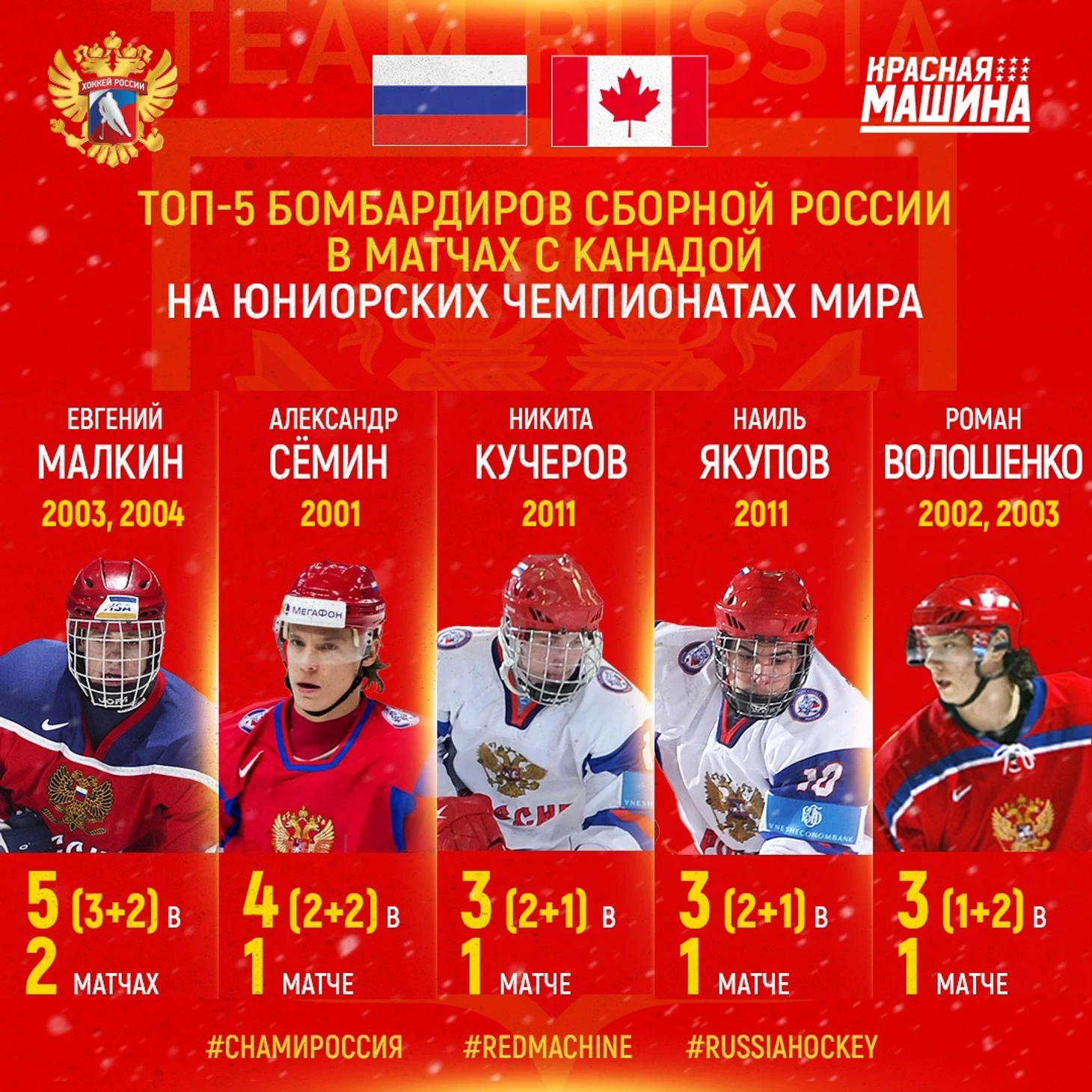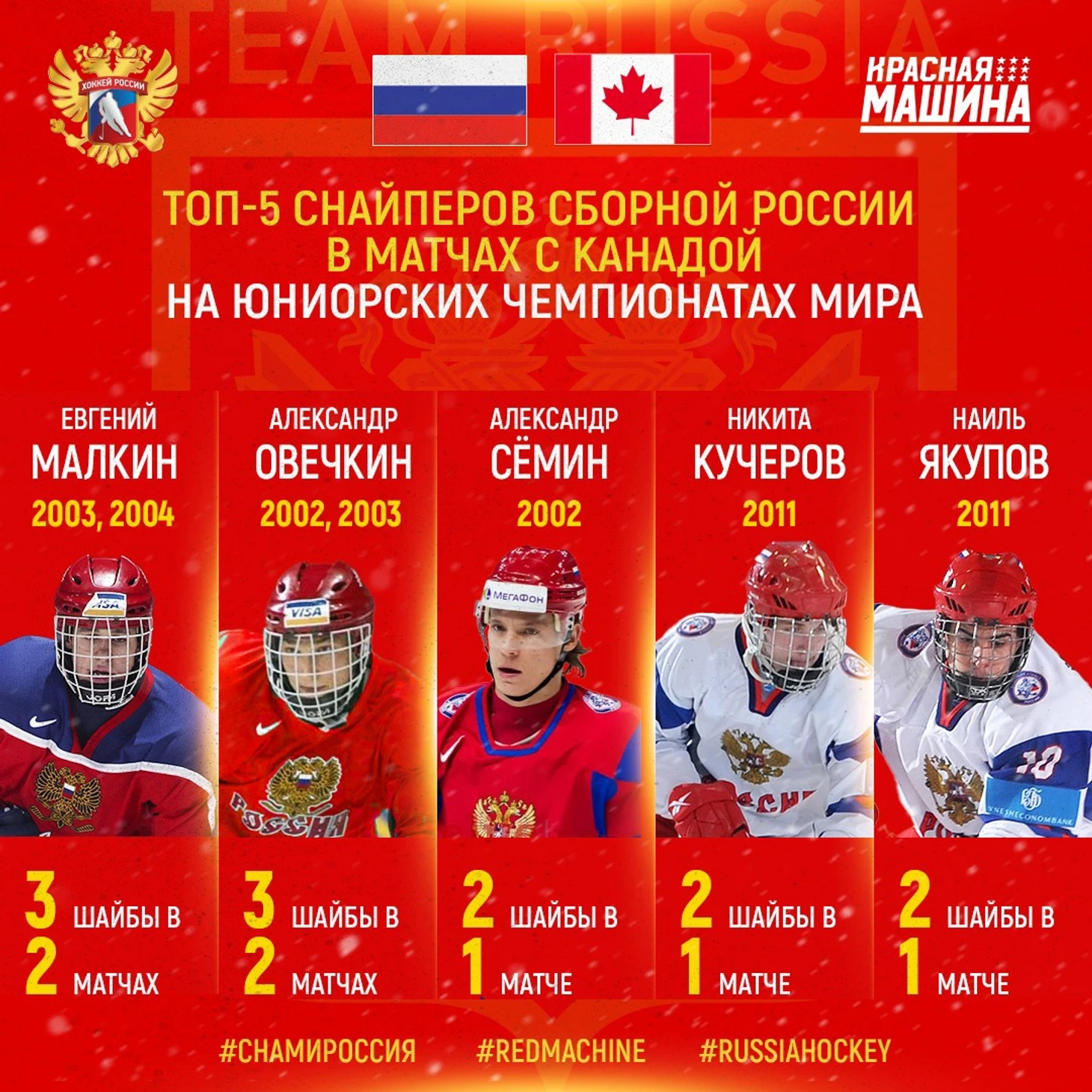 Да, это были Евгений Малкин и Александр Овечкин! Оба играли против Канады дважды (Овечкин – в 2002-м и 2003-м, Малкин – в 2003-м и 2004-м), оба забросили в них в общей сложности по 3 шайбы, и оба отметились дублями в своих первых встречах! Кроме того, дважды в одном матче красный свет за воротами канадцев на ЮЧМ зажигали Александр Семин в 2004-м (он повторит этот трюк спустя 6 лет в Квебеке), Никита Кучеров и Наиль Якупов в 2011-м, Николай Жердев делал это в 2002-м и Антон Дубинин – в 2003-м.