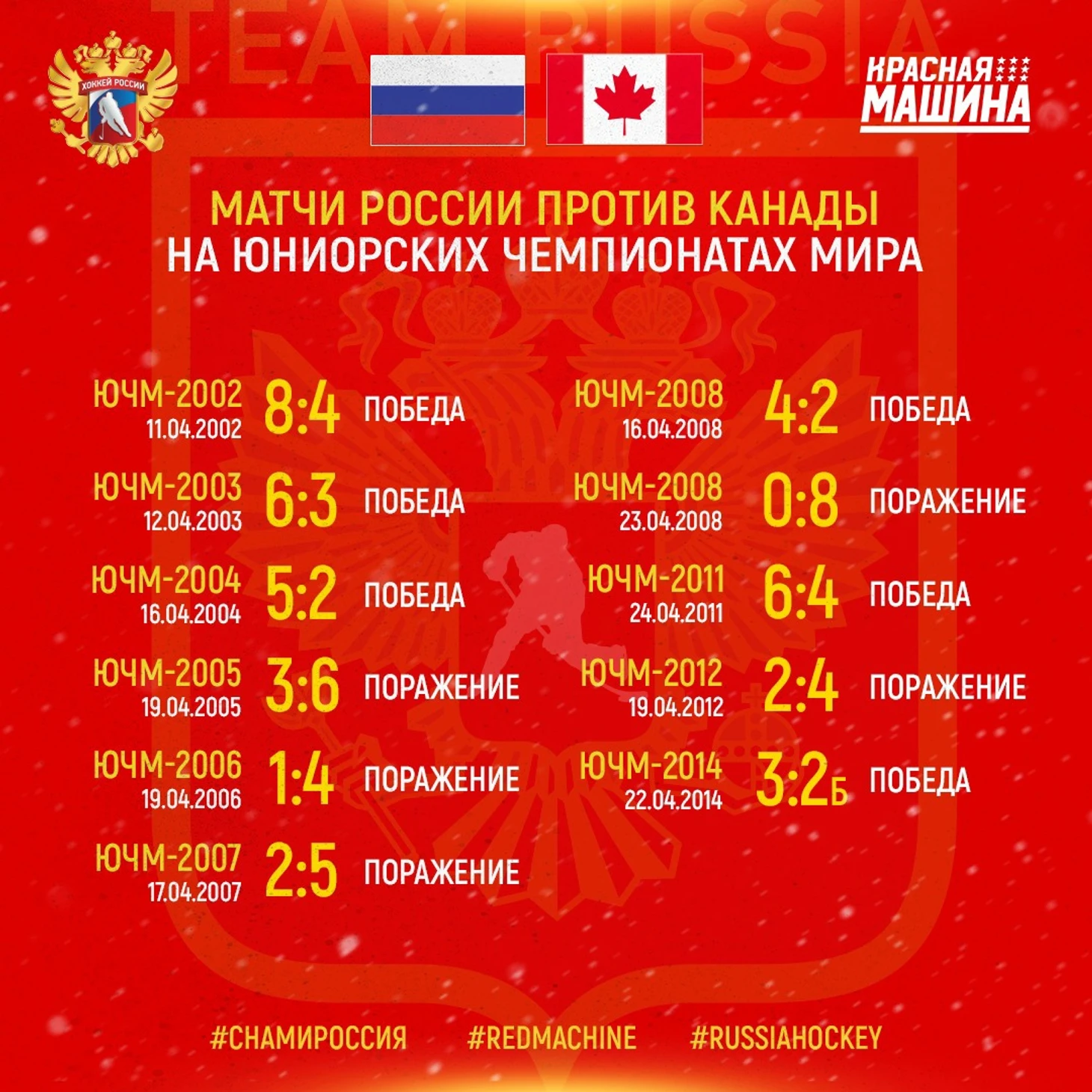 Финал станет 12-й встречей соперников на ЮЧМ – и первой с 2014 года. Почему так? Все просто – последние 7 турниров на предварительном этапе Россия и Канада оказывались в разных группах. Все любят рейтинги и мощные матчи в финале, но случай регулярно смешивал нам с вами карты.