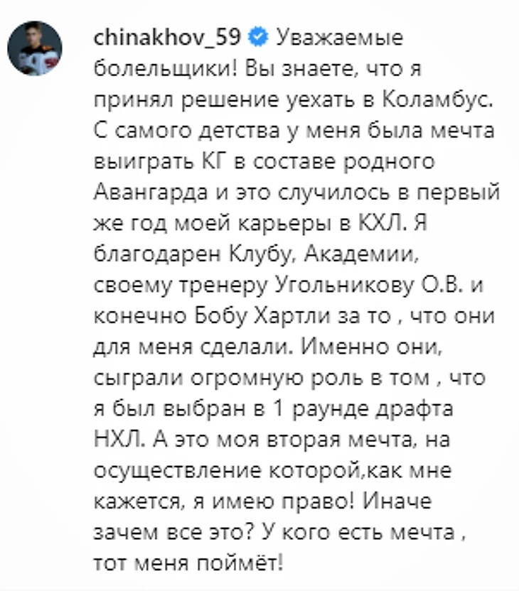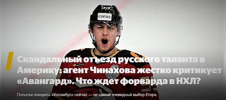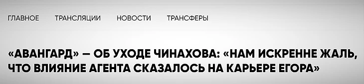 Казалось бы, Кубок Гагарина вместе со своим родным клубом завоевал, в сборную привлекают, хорошая статистика 53 игры, 24 (15+9) очка, тренер Боб Хартли, болельщики ценят, что еще надо? Остается только работать и прогрессировать, чтобы улететь зрелым игроком в НХЛ исполнять свои детские мечты. Но мы не будем забывать кто является агентом Чинахова и просто заглянем в новостные сводки, где нас ждет следующее: