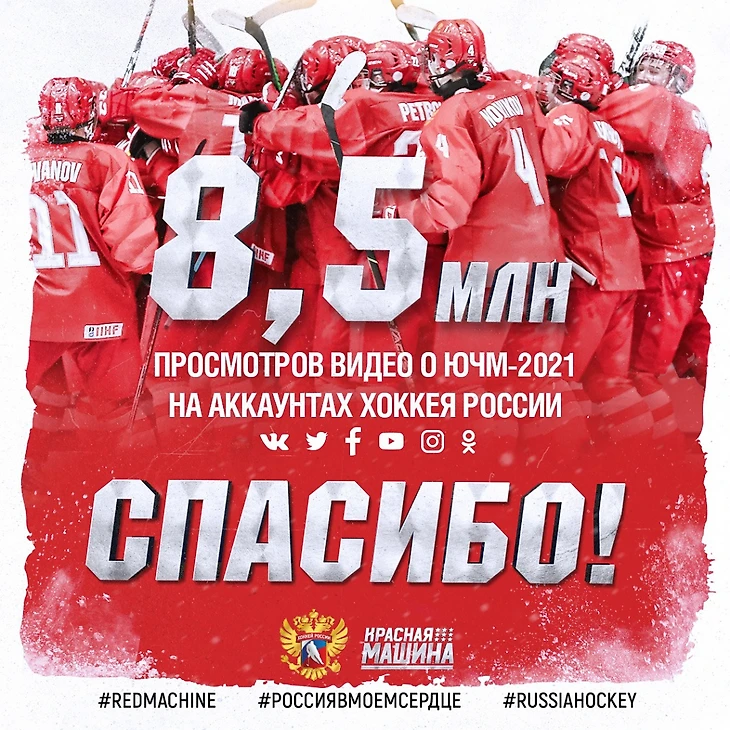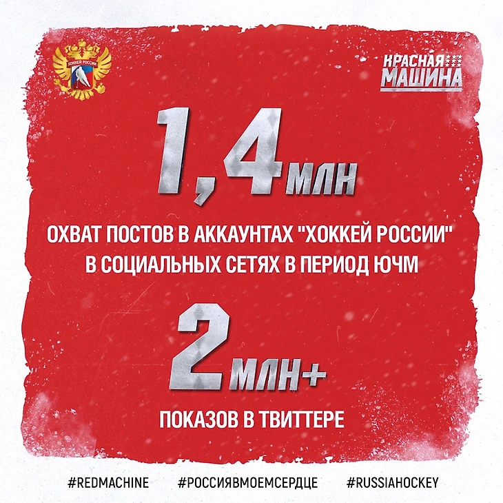 Трудно будет перебить картинку про 8,5 млн просмотров, но 1,4 млн тоже нельзя игнорировать. Именно столько составил охват постов в аккаунтах «Хоккей России» в социальных сетях в период ЮЧМ. Если долго смотреть на изображение – можно различить и ваш собственный лайк где-то там. Если пользуетесь твиттером и подписаны нас – хорошо. Если нет – подпишитесь.