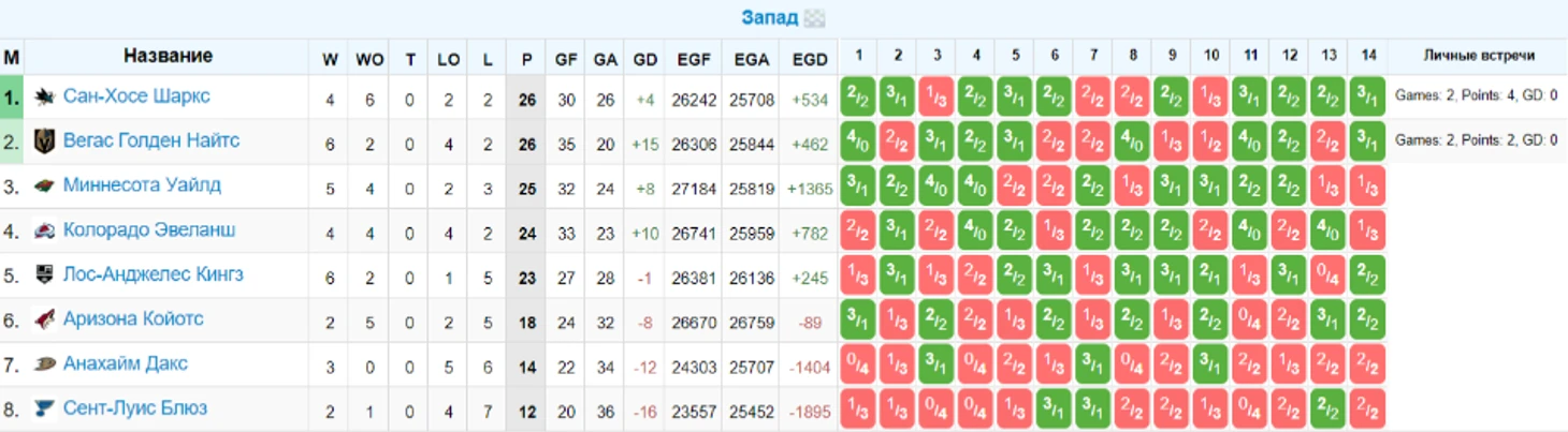 Опять же счастливый жребий отправил к капитану сан-хосе игроков, которые привели его к победе в дивизионе в напряженной борьбе с Вегасом, Ниже была напряженная борьба верх в которой одержали Миннесота и Колорадо. Отмечу, что прошлый победить КС Аризона. Прошла мимо плей-офф.
