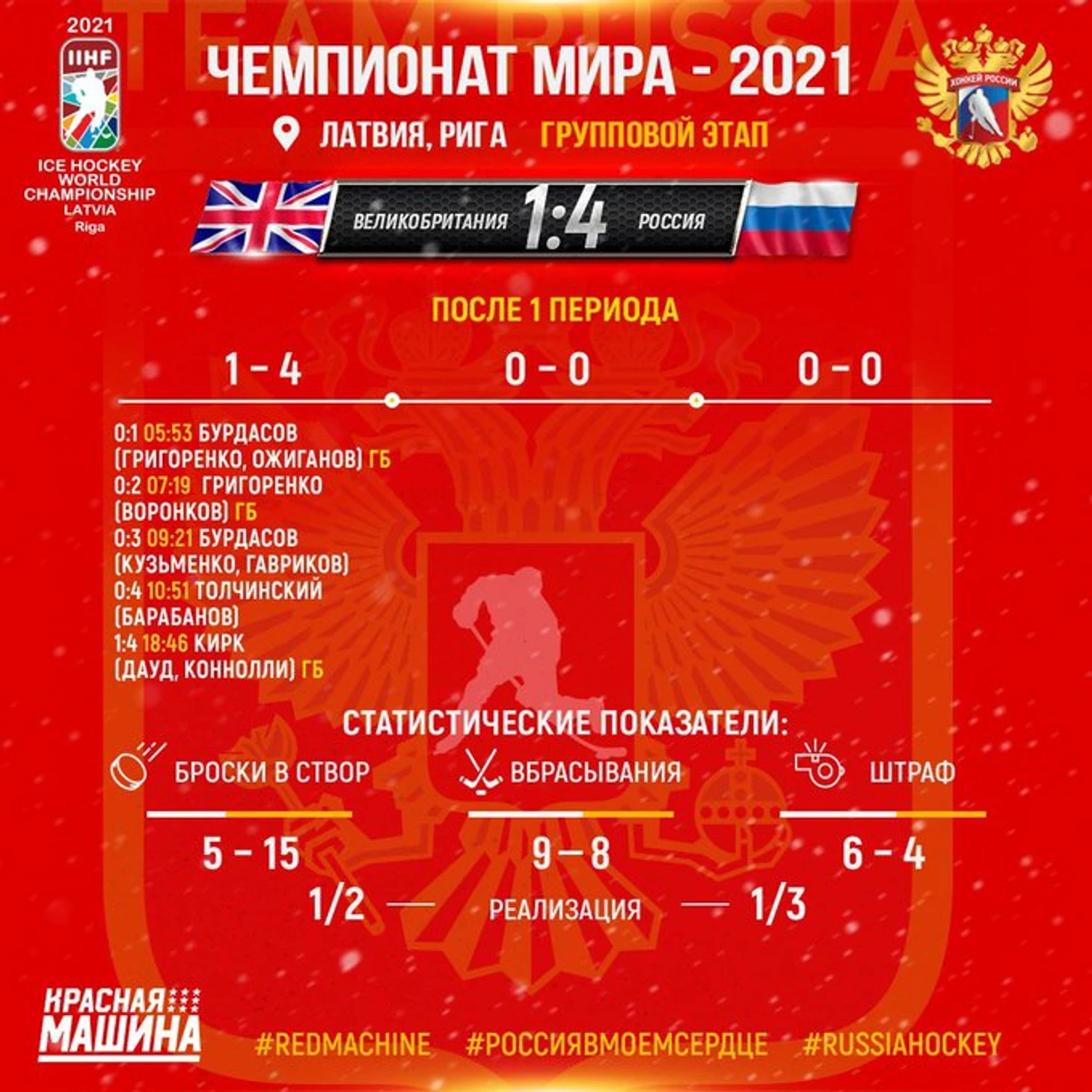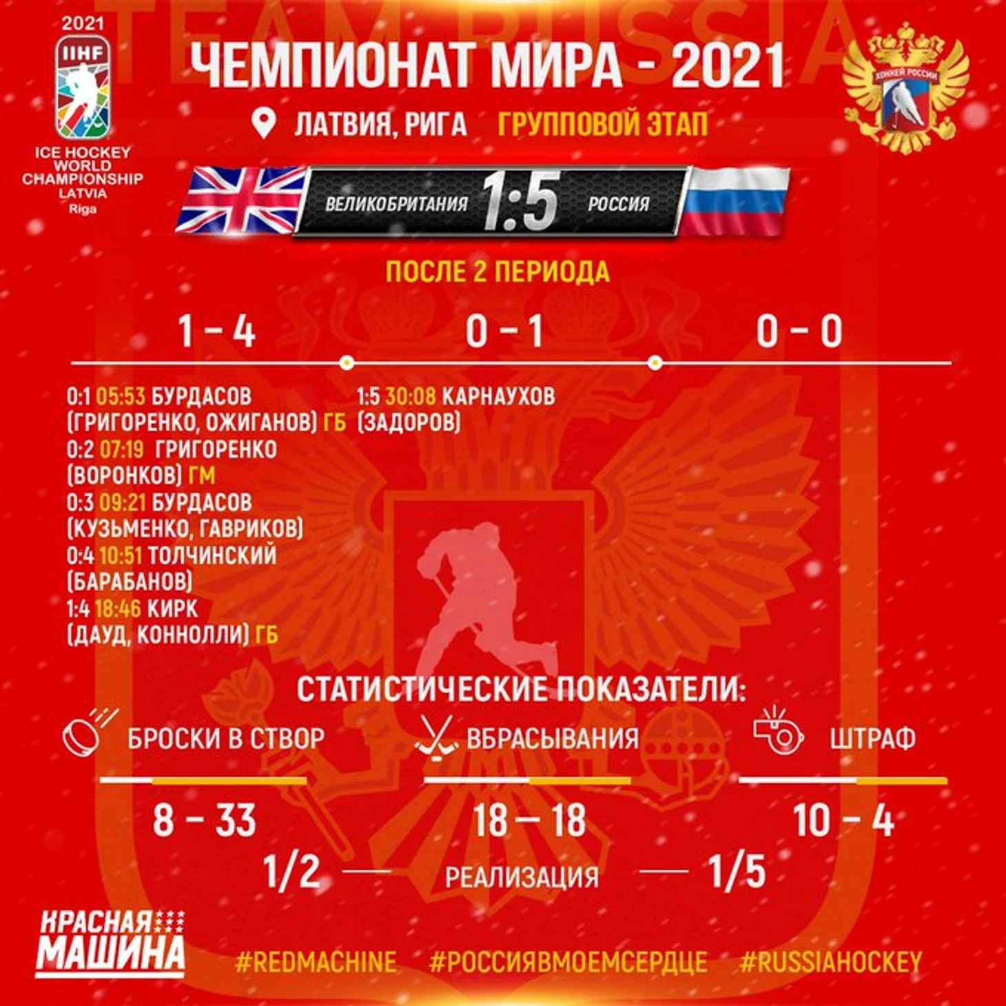 18:25 Вторая победа России на ЧМ-2021 – 7:1, спокойно, без унижений, громим Великобританию. 6 очков, 11 заброшенных шайб – полет нормальный.