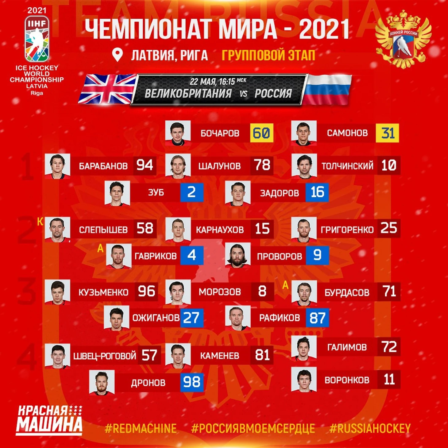 15:25 Состав сборной России на матч с Великобританией: как и ожидалось, Толчинский – в первом звене, Бочаров – основной вратарь. Кузьменко – в третьей тройке нападения, с Морозовым и Бурдасовым, а Галимов и Воронков, кажется, поочередно будут выходить в четвертой. Из заявки пропал Тимкин.