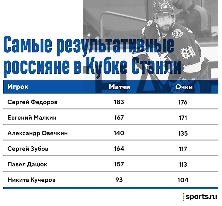 Кстати, 4 очка позволили Кучерову установить еще одно достижение – он обошел Алексея Ковалева и вышел на шестое место в списке самых результативных россиян в истории Кубка Стэнли.