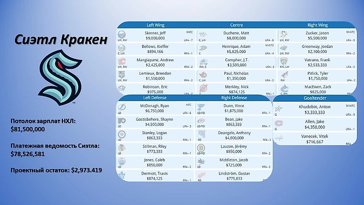 Сложно сказать даже сейчас, за пару месяцев до драфта расширения, чем будет руководствоваться генеральный менеджер Сиэтла Рон Фрэнсис, каким образом будет строить команду. Сейчас спрогнозировать развитие событий на драфте проблематично даже на 50%, 30% уже станут успехом. Эту виртуальную планку, пожалуй, для себя и обозначу. И сразу поясню момент, который для кого-то может быть непонятным. Неограниченно свободных агентов, чьи контракты заканчиваются после этого сезона (Тэйлор Холл, Фредерик Андерсен, Томаш Татар и т.д.) в списках не будет. Сиэтл, конечно, может выбирать таких хоккеистов, а их текущие франшизы, соответственно, могут их защитить, но практического смысла в этом мало, игроки все равно выйдут на рынок свободных агентов и будут иметь возможность подписаться с абсолютно любым клубом. Потому в протект-листах из числа хоккеистов, у которых контракт закончится после этого сезона, будут обозначены только ограниченно свободные агенты, то есть, игроки с истекающими контрактами новичков, а также игроки, выступающие в Европе, права на которых до определенного времени закреплены за клубом в НХЛ и перейдут Сиэтлу, если он их выберет (Форсбака-Карлссон, Каменев).