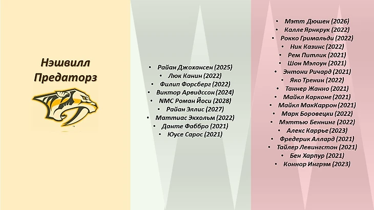 Нэшвилл, пожалуй, оставит для Сиэтла один из самых разнообразных и вкусных списков для выбора. Тут и опытные Ярнкрук с Казинсом, и страшный здоровяк Боровецки, созданный специально для каста фэнтези о каннибалах-великанах, а также перспективные Питлик, Тренин, Каррье, Жанно, Ингрэм. Но выбор Ситэла падет, предполагаю, на Мэтта Дюшена. Это в определенной степени риск. Как это ни странно для какого-то, более рациональным и надежным выбором был бы тот же Калле Ярнкрук, швед никогда не прыгнет выше головы, но и ниже определенного уровня не опустится. Возможен также вариант с Джохансеном, а Дюшена, напротив, захотят сохранить, но есть ощущение, что в ренессанс Райана у руководства Предаторс веры побольше. Вариант защиты без кого-либо из четверки защитников, уверен, даже рассматривать не стоит. Линия обороны традиционно является главной движущей силой Нэшвилла не первый сезон. Роман Йоси имеет запрет на перемещение, а также негласную, но всем понятную и полную неприкосновенность, а от Эллиса, Экхольма или прогрессирующего Фаббро может отказаться только сумасшедший. Допускаю также сценарий, при котором Нэшвилл захочет скормить Кракену Казинса или, скажем, Гримальди, сдобренного пиками или, например, отлично проявившим себя силовым форвардом Жанно.