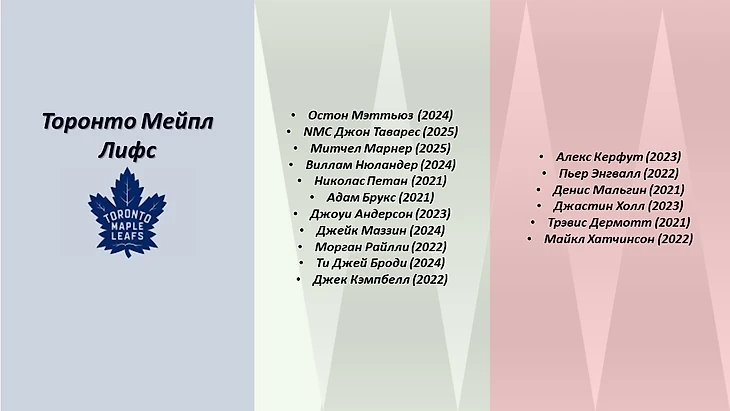 Для Торонто расклад перед расширением не самый радужный. Чтобы вписаться в минимальные требования, придется номинально защищать совершенно бесполезных Петана и Брукса, поставив под удар Крефута, Энгвалла и Холла. Решать свою проблему Мейпл Лифс, полагаю, будут посредством поиска вариантов сделки, потому что при таком раскладе Фрэнсис, очевидно, заберет Холла, чего в Торонто , уверен, никто не хочет, потому как поздно созревший защитник стал едва ли не ключевым игроком обороны команды. Думается, Торонто попробует достичь договора вокруг фигуры совершенно не нужного команде Трэвиса Дермотта, доплатив хорошим минорным активом. В ином случае Сиэтл получит еще одного отличного защитника, а Торонто заметно ослабит и без того не самую стабильную оборонительную линию.