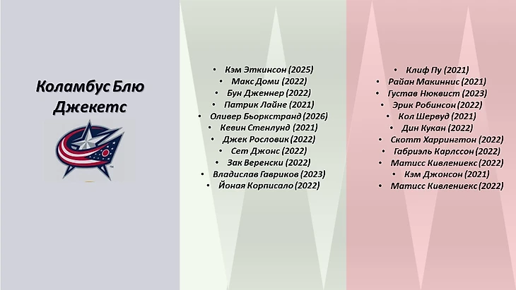 Коламбус Блю Джекетс, судя по всему, не является желаемым вариантом продолжения карьеры ни для одного хоккеиста лиги. Ну, кроме Джека Рословика, потому что это, похоже, единственное место, где в нем готовы увидеть центра первого звена. Добился трейда в Виннипег Пьер-Люк Дюбуа, ходят слухи о желании Сета Джонса также сменить команду, говорят о том, что и Лайне уже успел разочароваться в новой команде и сполна осознать, насколько он зависимый игрок. Но отталкиваться нужно от текущей ситуации. Понятно, что Лайне никто просто так Сиэтлу не отдаст, насколько бы неудовлетворенным он ни был. Есть 10 легко определяемых игроков, которых Коламбус защитит абсолютно точно. Шервуд, Нюквист, Тюркауф и Робинсон, защитники Кукан и Карлссон, а также вратарь Кивлениекс останутся незащищенными. Выбор Сиэтла, полагаю, сведется к форвардам и будет сделан в пользу Эрика Робинсона. Да, Густав Нюквист может стать валидной снайперской опцией, но у него нехорошая история травм и не самый удобный контракт до 2023 года. Эрик Робинсон же, судя по всему, имеет очень неплохую перспективу стать крепким пауэр-форвардом. Хороший мув в 3-4 звено.