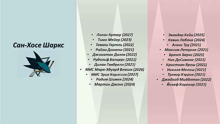 У акул, как и у Далласа, весьма неприятная история с защитой, не набирается необходимая квота по игрокам без потери кого-то действительно ценного. С другой стороны, эту ситуацию можно рассматривать, как возможность сбросить не самый лучший контракт проблемного Эвандера Кейна, погрязшего в долгах. Для Сиэтла это шанс заполучить опытного силового форварда с набором, как очевидных плюсов, так и столь же очевидных и в большинстве своем не хоккейных минусов. Вероятно, также будет возможность прихватить Брента Бернса, Хосе, как минимум, предпримет попытку сбросить ужасный контракт объективно сдавшего защитника, но, полагаю, нужно будет доплатить очень существенно, чтобы Фрэнсис согласился пристегнуть к своей ноге эту гирю. Но, полагаю, Сиэтл не станет спасать утопающего, тем более тяжелых контрактов я виртуально набрал и без акул предостаточно, надо все-таки соблюдать логику и стараться вписаться в потолок, он не резиновый даже для новичка лиги. А потому, на мой взгляд, Рон Фрэнсис не станет ввязываться в проблемы Сан-Хосе и спокойно, без шума заберет отсюда условного Джейкоба Миддлтона. Но, если Сан-Хосе предложит действительно существенную компенсацию за то, чтобы Сиэтл забрал какой-либо из ужасных контрактов, возможны варианты.