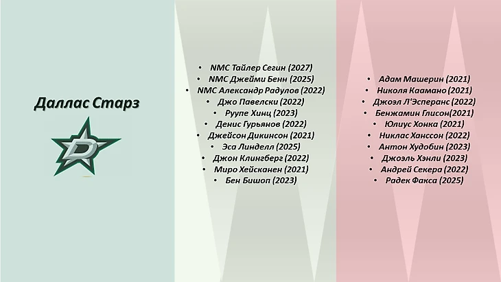 Даллас прямо сейчас находится в довольно щекотливом положении, им просто некого оставить для выбор Сиэтлу в списке нападающих. Напомню, необходимо минимальное присутствие в листе незащищенных двух форвардов с контрактом на сезон 2022, проведших 27 игр в текущем сезоне либо 54 игры за два последних. Сегин, Бенн, Радулов, Хинц, и Гурьянов абсолютно неприкосновенные кандидатуры. Джо Павелски, не смотря на солидный возраст, думается, тоже. Таким образом, в ростере остается ровно два игрока, подходящих под обозначенные параметры. И один из них Радек Факса, важнейший игрок боттома. Собственно, сам тот факт, что, похоже, точно придется поставить под удар Факсу, уже неприятен. Но, полагаю, Далласу удастся договориться с Фрэнсисом на удобный для себя вариант и в Сиэтл поедет хорошо знакомый российским болельщикам Антон Худобин, отличный бэкап точно не помешает новой франшизе. Даллас же с вратарской точки зрения ничего не потеряет. Восстановится от повреждения Бен Бишоп, один из лучших вратарей лиги, а за его спиной пару сезонов будет расти и готовиться стать первым номером Джейк Оттингер.