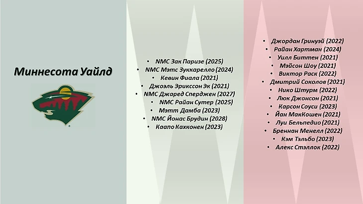 Более половины защищенных Миннесотой имеют пункт о запрете на на перемещение, а именно Паризе, Зуккарелло, Сперджен, Сутер и Брудин, и я очень сильно сомневаюсь в том, что кто-то из них согласится от этого пункта отказаться, что подводит Уйалд к выбору - На драфт расширения выйдет либо Мэтт Дамба, либо кто-то из тройки Гринуэй - Эк - Фиала, остальные кандидатуры куда менее заметные и стоящие, их рассматривать в контексте выбора Сиэтла нет большого смысла, только в контексте доплат со стороны Миннесоты, что, к слову, не исключено, но прочитать формат возможной сделки довольно проблематично, в головы к менеджерам залезть я не могу. Допускаю, Сиэтлу будет предложено забрать Райана Хартмана, Виктора Раска или Нико Штурма вместе с проспектом Бекманом, Девором или Жиру. Но я все-таки буду отталкиваться в данном случае от расширения, как такового, представим, что эта процедура проходит в вакууме и не подразумевает сделок. Если в случае с Баффало такое развитие событий можно спрогнозировать, то здесь слишком уж достойный и разнообразный список предоставляет Миннесота, договориться с Фрэнсисом будет весьма проблематично. Предполагаю, выбор Уайлд будет сделан, прежде всего, в пользу Дамбы, как бы его ни костерили болельщики Миннесоты, а это автоматически означает, что защита будет оформлена по схеме 8+1. Что касается трио обозначенных выше форвардов, то выбор, полагаю, будет сделан в пользу Эка и Фиалы, найти равноценную замену для них сложнее, чем для Джордана Гринуэя, его Сиэтл и возьмет. Хороший пауэр-форвард для 2-3 звена и спецбригад, который добавит новой команде мускул и BLMовского шлейфа, это сейчас модно.