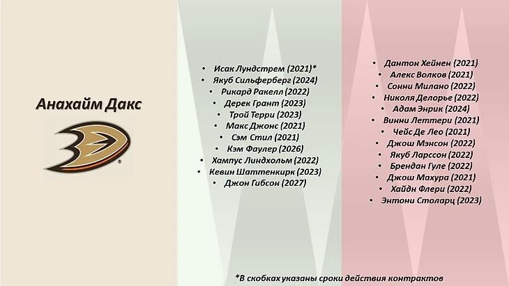 Нельзя сказать, что такой вариант защиты безальтернативен, но, предполагаю, именно в таком составе игроки будут от расширения освобождены. Пожалуй, максимально спорная кандидатура - Дерек Грант, форвард нижней шестерки, который проявил свои лучшие качества на уровне НХЛ уже ближе к тридцати годам. Думается, Анахайм подписал его на три сезона не в качестве спойлера для расширения, Грант им нужен именно как боевая единица, часть паззла для построения команды уровня ПО. В жертву, вероятно, будет принесен Адам Хенрик. Еще до недавнего времени я полагал, что незащищенным останется Исак Лундстрем, но тот добился некоторого прогресса и, полагаю, убедил руководство Анахайма в целесообразности своего нахождения в системе, а Хенрик неожиданным образом по ходу сезона попал в довольно затяжной спад и в итоге прошел через процедуру вейвера. Не похоже, что это был просто воспитательный момент да и куда, собственно, воспитывать зрелого и состоявшегося игрока. Анахайму, видимо, Адам не очень-то и нужен, контракт совсем не детский и действует до 24 года, а в системе есть Зеграс, Стил, Гру, всё те же Лундстрем и Грант, а также ветеран Гецлаф, который, полагаю, в межсезонье переподпишется на более лояльных для Анахайма условиях. Центральная ось укомплектована достаточно хорошо, а терять края в условиях довольно скудного рынка Анахайму не захочется, Сиэтлу же опытный центр непременно пригодится. В качестве альтернативных вариантов нельзя исключать Волкова, Мэнсона, Махуру, Флери и Ларссона, но, полагаю, если Хенрик действительно останется доступным, выбор будет очевидным.