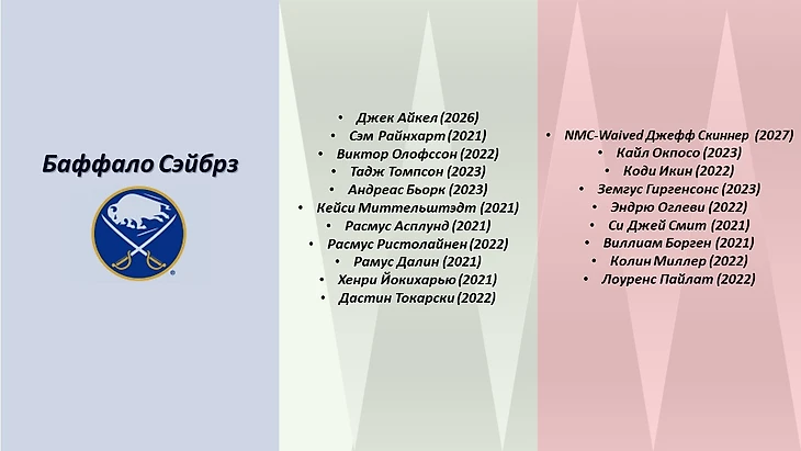 Убежден, что минимум на 90% список Баффало будет выглядеть именно так. Возможно, в числе защищенных окажется не Андреас Бьорк или Расмус Асплунд, а, скажем, Коди Икин или Земгус Гиргенсонс, но это всё частности, не имеющие никакого отношения, полагаю, к тому, кого заберет Сиэтл. Практически не сомневаюсь, что здесь сработает устраивающий абсолютно все стороны сценарий и состоится первая сделка в рамках расширения. Джефф Скиннер снимает запрет, Баффало, соответственно, его не защищает и освобождается от неудобного контракта, а Рон Фрэнсис забирает своего старого товарища по Каролине в Сиэтл и минора/пики в качестве компенсации за лояльность. Да, контракт слишком длинный и слишком тяжелый, но, во-первых, Сиэтл сможет себе такую роскошь позволить, во-вторых, Скиннер, как бы то ни было, хороший снайпер с огромным опытом, а молодой франшизе такой игрок необходим. Сам Джеф получит шанс встряхнуться, перезапуститься и еще пошуметь в НХЛ, время и возможности для этого у него есть. Сиэтлу, по большому счету, брать больше некого, они точно будут пробивать вариант со Скиннером.
