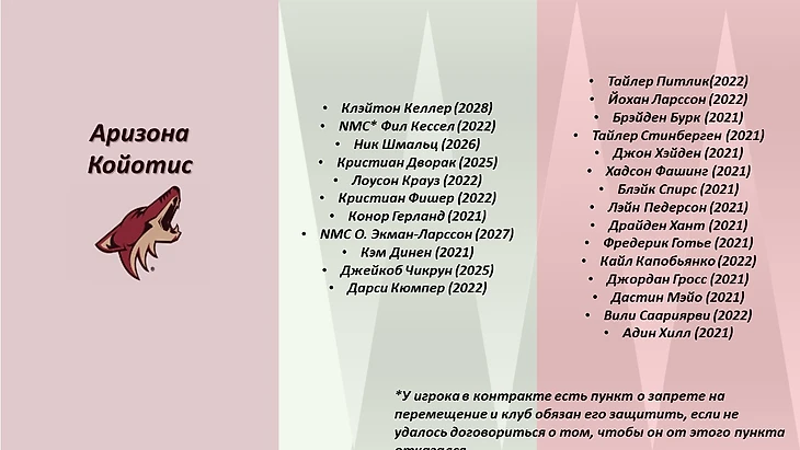 Койоты совершенно точно оставят для Сиэтла один из самых скудных пулов для выбора. В качестве возможного варианта тут есть Кайл Капобьянко, который ходит в категории «вот-вот проявит себя» уже то ли третий, то ли четвертый сезон. В нападении, полагаю, возможны варианты, я не убежден в том, что Фишер, который, очевидно, может на площадке гораздо меньше, чем предполагалось (парня в свое время окрестили чуть ли не наследником великого Шейна Доуна), вместо него койоты могут защитить того же Питлика, молодого Педерсона или Йохана Ларссона, но, предполагаю, Фишеру дадут еще один шанс проявить себя. В защите Аризона имеет только два очевидных кандидата на защиту. Экман-Ларссон имеет в контракте запрет, но и без него сложно было бы представить сценарий, при котором Аризона не защитила бы шведа. Если они со своим многолетним лидером и расстанутся, то только в результате обмена. Второй - Джейкоб Чикрун, не так давно подписавший контракт до 2025 года и, чтобы не защитить его, нужно быть душевнобольным человеком. На расширение точно отправится Илья Любушкин, для этой цели с ним продлили контракт на 2022 год, чтобы вписаться в требования. Сиэтл же, предполагаю, обойдет стороной и Капобьянко, и финна Саариярви, и Тайлера Стинбергена, не оправдавших выданных по юниорам авансов, и сделает выбор в пользу крепкого Тайлера Питлика. В качестве альтернативы стоит обозначить вратаря Адина Хилла, но не думаю, что это реалистичный вариант, поскольку на расширении выйдут куда более квалифицированные вратари других клубов, а также можно будет побороться на рынке, например, за Андерсена. Потому не вижу объективных предпосылок для выбора Хилла.