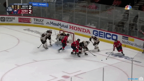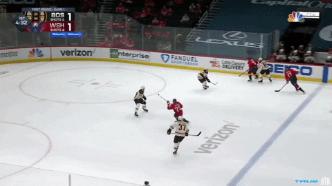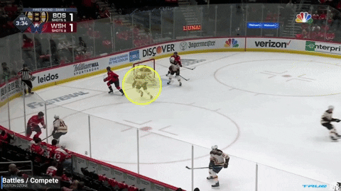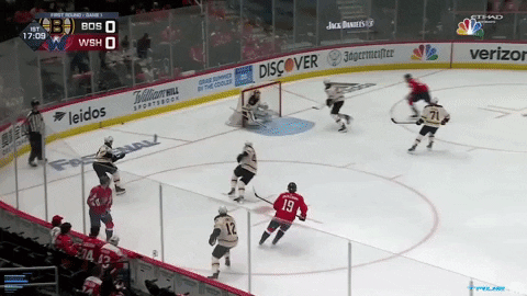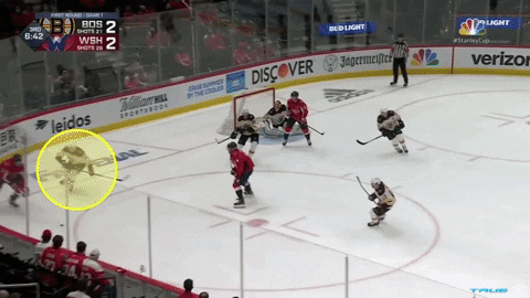 Защитники «Бостона» почти не вылезают за пределы точек вбрасывания (кстати – так играет «Авангард» в КХЛ, почитайте) и во время блока выдвигаются навстречу броску, сокращая угол обстрела, либо же накрывают бросок своей клюшкой до того, как соперник приложится по шайбе. Пример обычного блока из серии против «Вашингтона» – его делает центральный нападающий Курали, который выдвигается повыше.