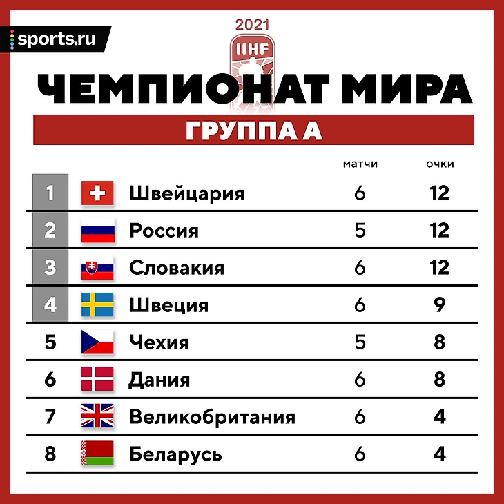 У Словакии остался остался один матч – против чехов, в котором для прохода в плей-офф им достаточно набрать одно очко. Но если сегодня сборная России обыгрывает шведов, то словаки выходят в плей-офф при любом исходе. На первое место словаки вряд ли заберутся, даже если обыграют чехов в основное время – Швейцария и Россия последние матчи проводят с аутсайдерами, а у словаков худшая разница шайб в личных встречах с лидерами группы А.