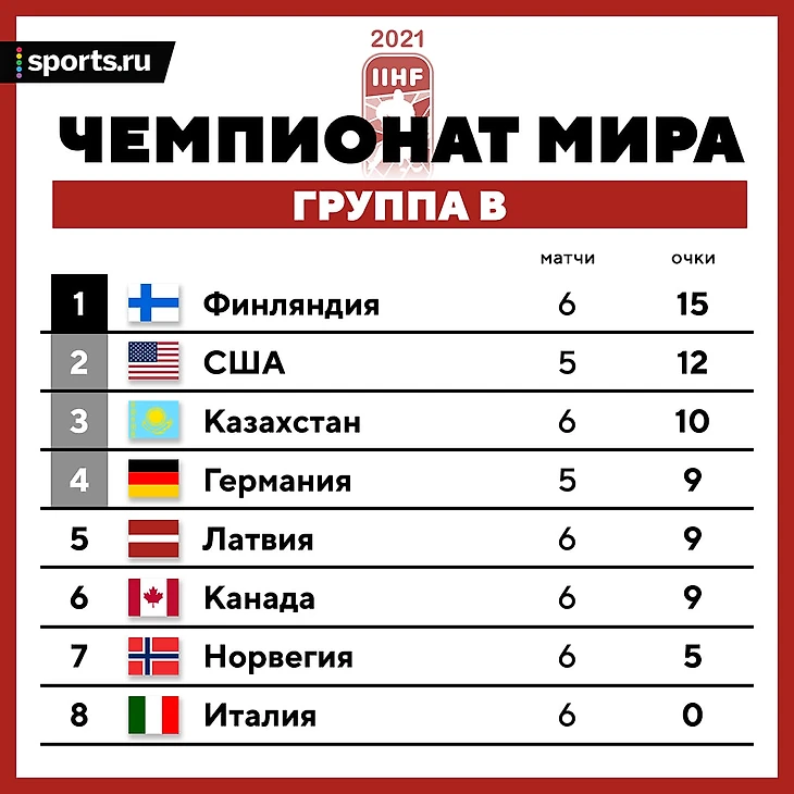 Если получится победить в овертайме или по буллитам – надо, чтобы сработали два варианта из трех: Германия в двух оставшихся играх (против США и Латвии) набирает не больше 3 очков; Латвия не побеждает Германию в основное время; Канада не побеждает Финляндию в основное время. У Казахстана перед немцами и латышами – преимущество по личным встречам.