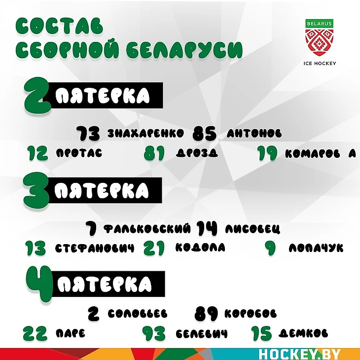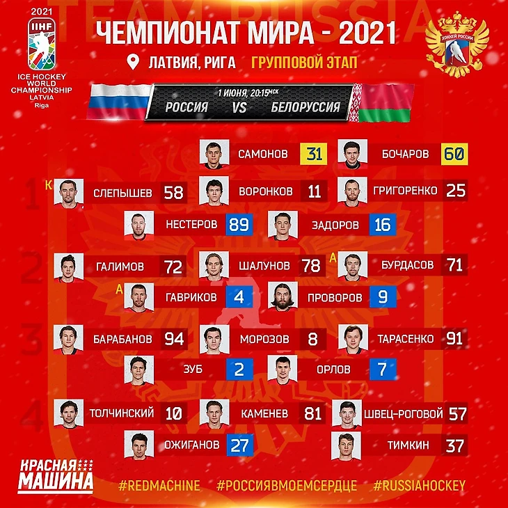 19:02 Состав сборной России на матч с белорусами. Шалунов вернулся – поставили во второе звено с Галимовым и Бурдасовым, с Тарасенко и Морозовым теперь Барабанов, Толчкинский – в четвертой тройке, Карнаухова нет в заявке.