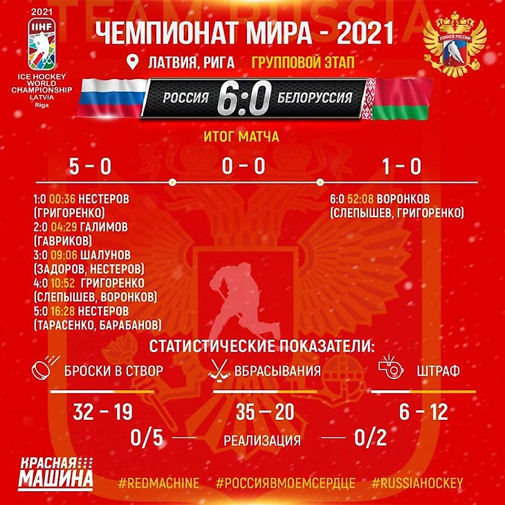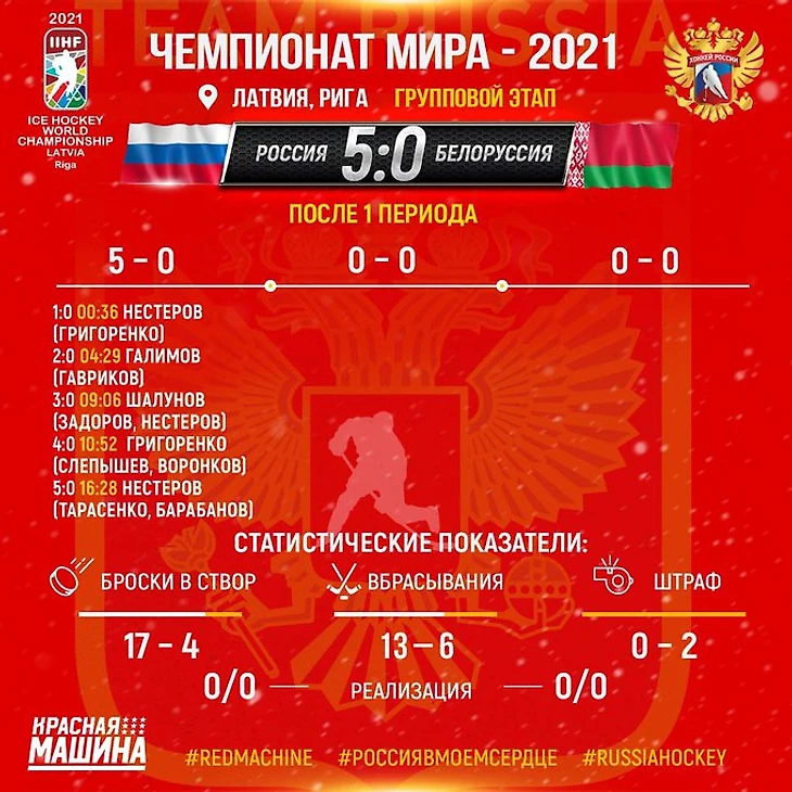 22:27 Россия с Беларусью тоже закончили – 6:0. Матч, который можно было заканчивать после 10 минут.