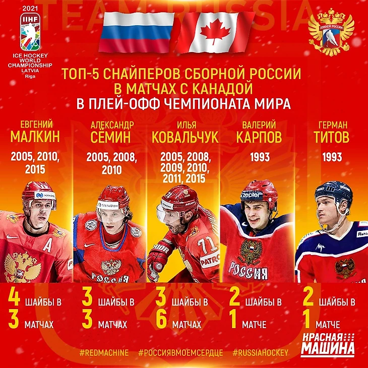 Россия - Канада на ЧМ-2021. Статистика встреч и видеотрансляция