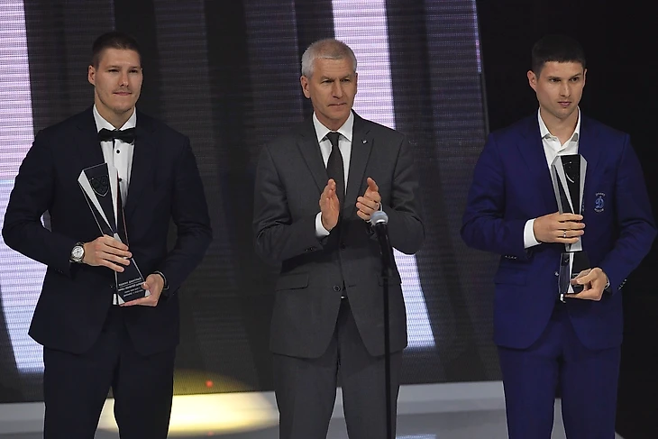 Теперь, что касается интриги относительно победителей в номинациях. Все иностранные игроки и тренеры, получившие награды, записали видеообращения, что уже кажется странным. Ведь смысл таких номинаций в том, чтобы до последнего никто не знал имя победителя, оттого более яркими и приятными становятся моменты триумфа, но тут обладатели призов знали об этом заранее, даже на видео заметно, что эта награда им не очень-то и нужна, нет той радости, которая присутствовала в глазах победителей в этих номинациях ранее. Победители в номинации "Золотой шлем" - символическая сборная сезона, вообще практически в полном составе отсутствовали на церемонии. Из "великолепной пятёрки и вратаря" на сцену вышла лишь не менее великолепная двойка "Динамо" - Шипачёв и Яшкин, но ведь согласитесь, куда приятнее было бы видеть на сцене всех победителей номинации.