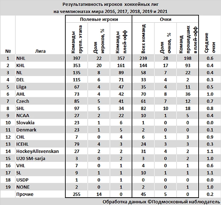 Как и следовало ожидать лучший "бомбардир" чемпионатов мира это НХЛ, за пять лет 397 полевых игроков лиги заработали 239 очков. Таким образом 22% игроков набрали 28%. Если рассматривать только команды прошедшие в плей-офф, то это 357 НХЛовцев, набравших 198 очков.