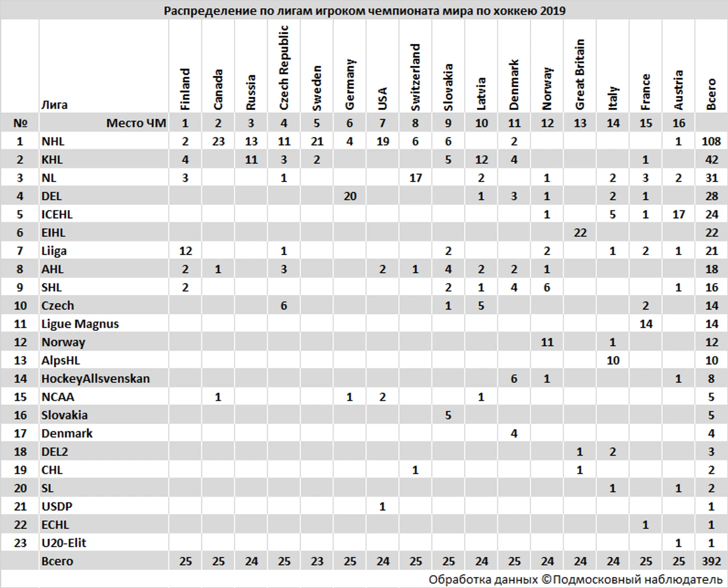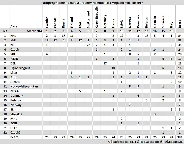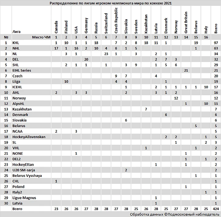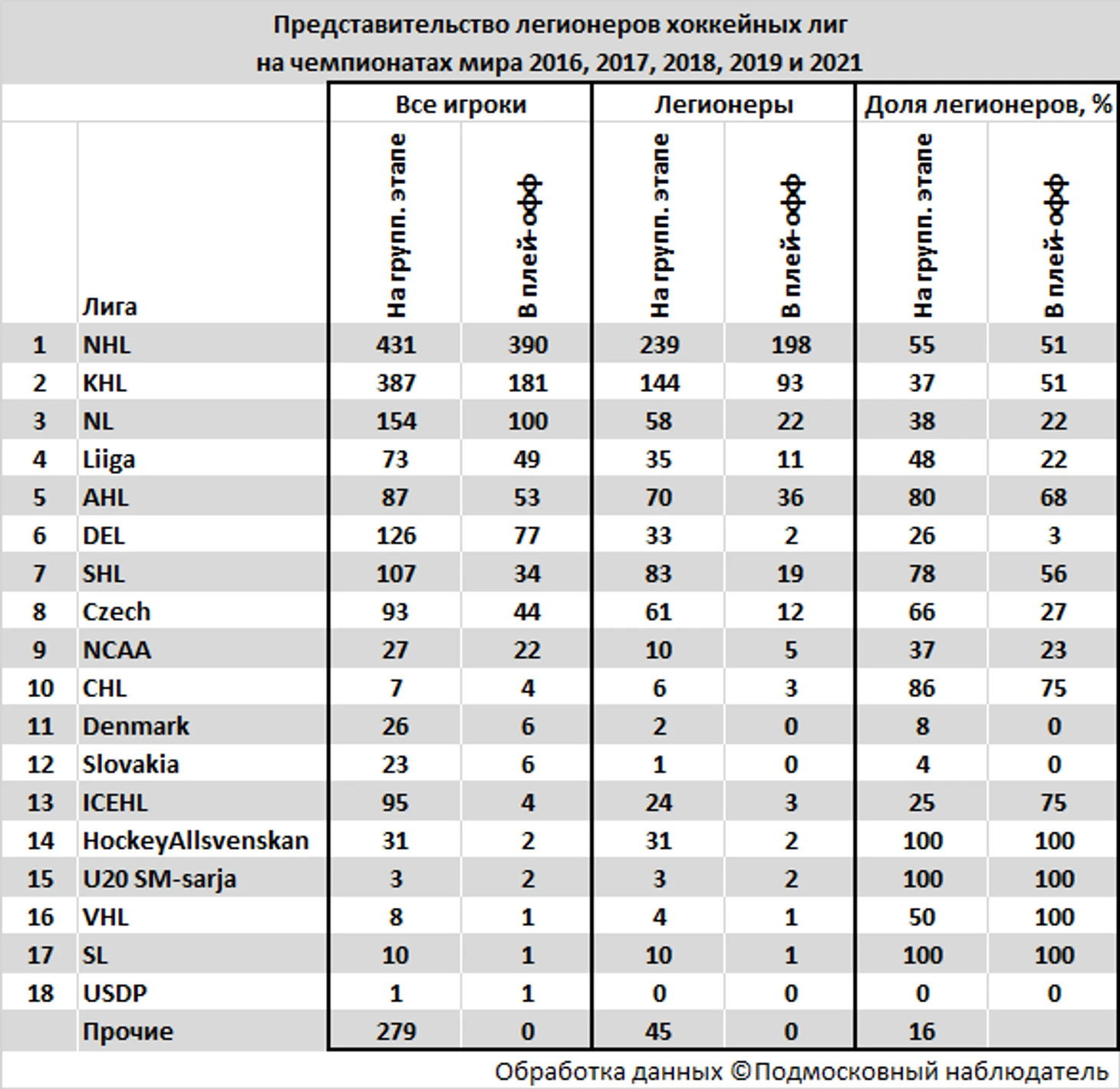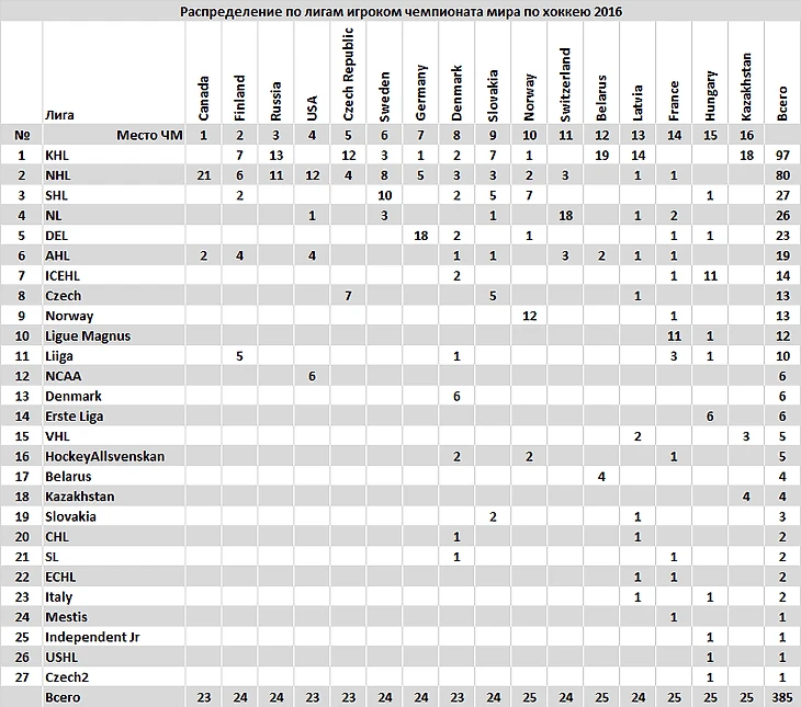 В 2016 году таких лиг было 27, НХЛ представляли 80 игроков, КХЛ - 97.