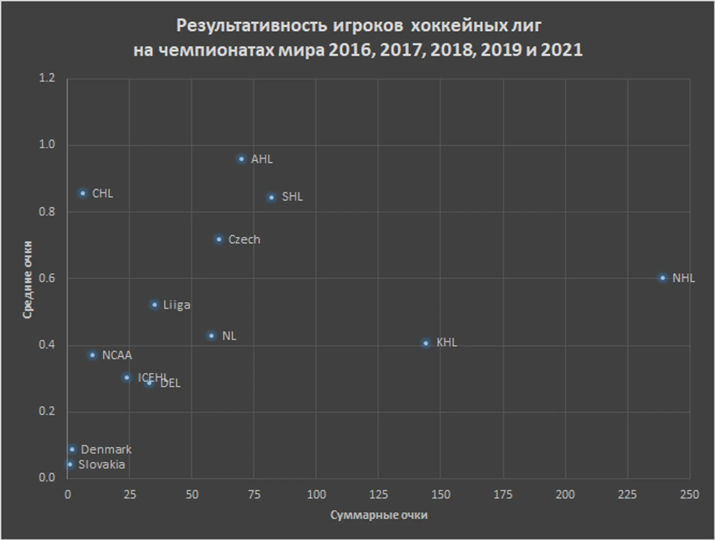 Если рассматривать лиги со значимым представительством, то наилучшую среднюю результативность показали игроки AHL, со средним 1 очком за чемпионаты. Хорошая средняя результативность у игроков SHL - 0.8 средних очков и хоккеистов чешского чемпионата - 0.7 средних очков.