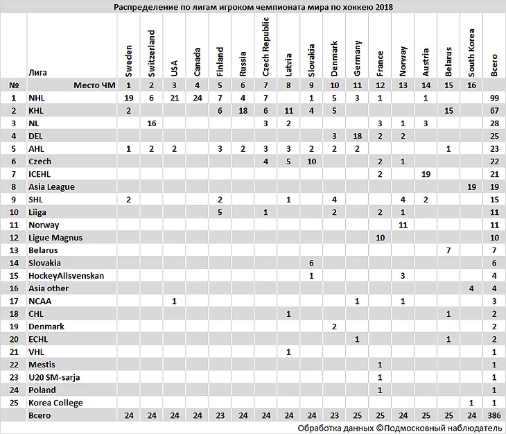 Из 25 лиг чемпионата 2018, из НХЛ приехали 99 игроков, из КХЛ - 67.