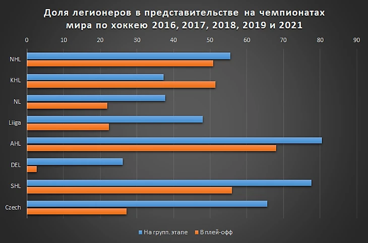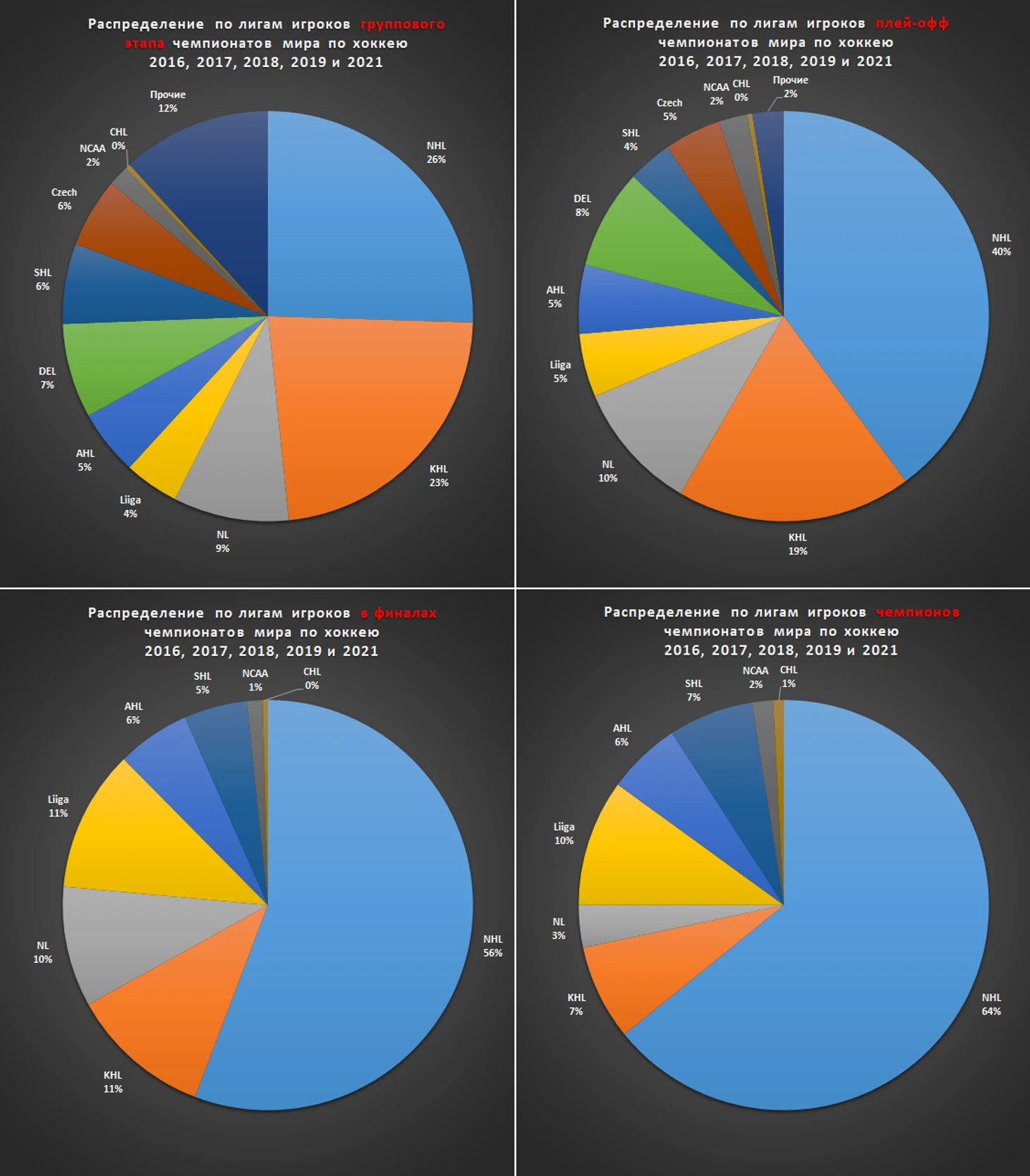 Попытаемся разобраться. Опираться будем на данные портала eliteprospects. Изучим представителями каких лиг являлись игроки пяти крайних чемпионатов мира 2016, 2017, 2018, 2019 и 2021 годов и как далеко они прошли по турнирной сетке.