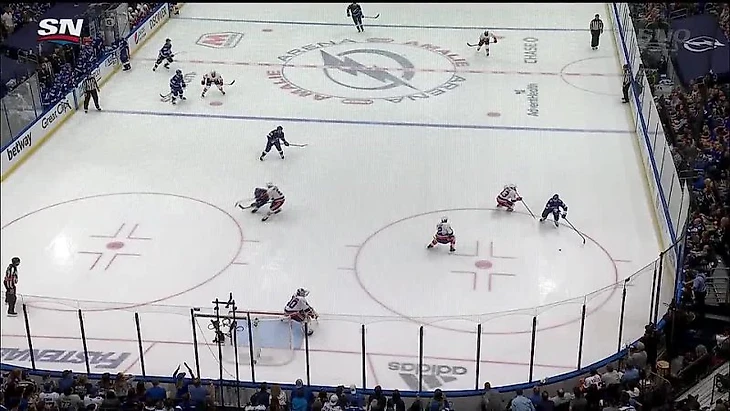Первый рефери - на линии ворот Айлендерс смотрит на Кучерова с шайбой и прессингующего его Барзала. Один лайнсмен - на синей линии Айлендерс и смотрит в зону Айлендерс в полоборота. Второй лайнсмен - между синей и красной - смотрит напротив себя. Ну и, наконец, главный "виновник торжетсва" - второй рефери. Он находится между синей Тампы и красной. Спиной к воротам Тампы.