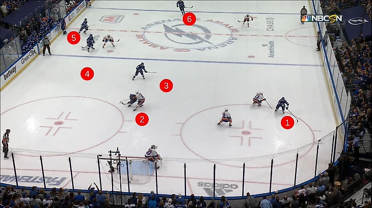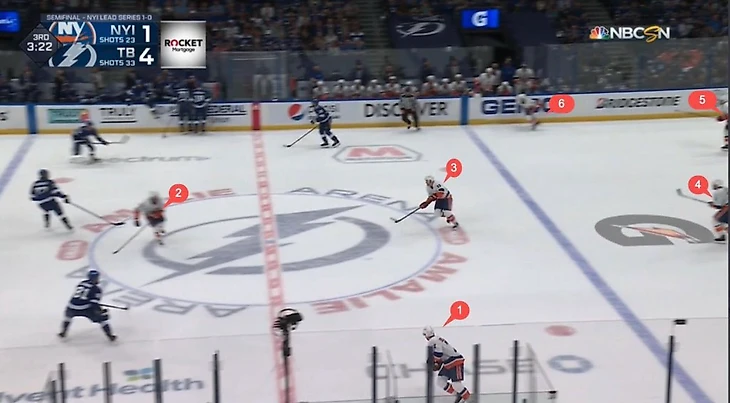 К сожалению, на видео не попадают одновременно все игроки, но в первую секунду, прямо с самого начала видео видно, что со скамейки Айлендерс выскакивает игрок (отмечен №6), когда два защитника, едущие на смену, находятся от борта метрах в 5-7, если не больше ещё. К сожалению, на этом видео не такой очевидный ракурс, как на том скриншоте с нарушением численного Тампой, но если покадрово смотреть первые 3-4 секунды, то, в общем-то...