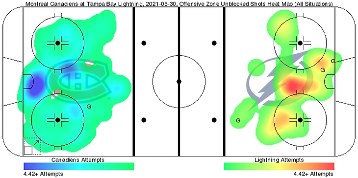 Но если вы вглядитесь в эту карту бросков, которая вроде бы отражает преимущество «Монреаля», вы увидите интересную штуку: на чужом пятаке «Тампа» создала не меньше, чем допустила на своем (кстати, подписывайтесь на мой телеграм, там еще куча деталей про этот финал).
