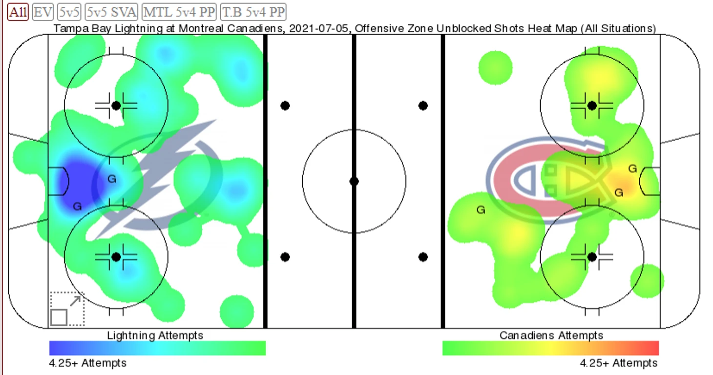 В четвертом матче Монреаль выдал высокую реализацию бросков. Сложно закладываться на это в дальнейшем. Карта бросков показывает, что Монреаль нечасто угрожал из слота. Хотя две шайбы Канадиенс пришли именно оттуда: