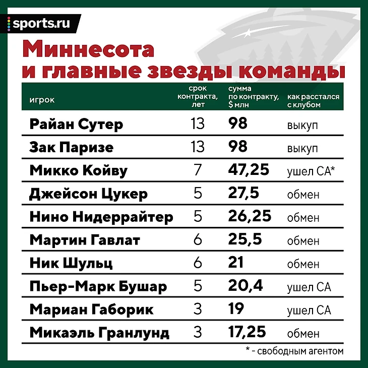 Тем не менее, Капризова можно понять: клуб за одно лето потерял двух защитников основы (Суси и Сутер), забил платежку выкупом двух звездных ветеранов, а в межсезонье набрал средних игроков и выписал чек на 5 млн Алексу Голигоски. К тому же лучшим центром команды остается Эрикссон-Эк, а Марко Росси перенес ковид в тяжелой форме с осложнениями на сердце и не очень понятно, сможет ли талантливый центр вообще играть в хоккей. Не забывайте, что до сезона-2025/26 мертвый кэпхит команды будет составлять 14 млн за сезон – с учетом того, что потолок зарплат в ближайшие годы вряд ли сделает серьезный скачок, клуб Капризова три года будет играть с урезанной кепкой, без звезд и серьезных перспектив сыграть хотя бы в финале конференции.
