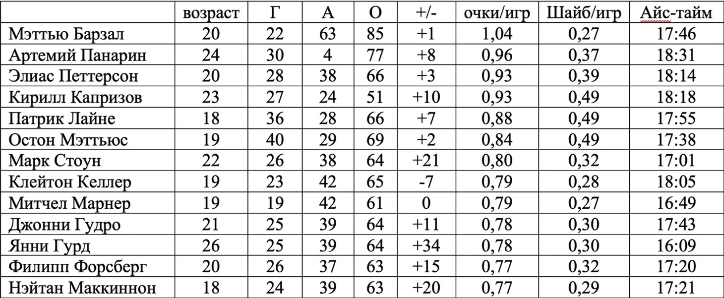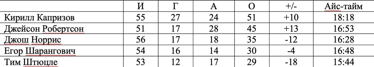 Разговоры, что Капризова нельзя оценивать как новичка и нечестно давать ему Колдера оставим для других дискуссий, тем более, его основные конкуренты тоже не зеленые юнцы (как Штюцле или Лафренье), а моложе всего на 2 года. Кирилл однозначно оказался самым ярким новичком сезона, смотревшись фаворитом на протяжении всего сезона, стал лидером своего клуба (и даже получил несколько голосов на Харт), в отличие от других новичков. Интересно оценить его результаты в контексте с другими топовыми новичками. В условиях укороченного сезона, предлагаю больше обращать внимание на относительные показатели, чем на абсолютные (как пример, по очкам Капризов занял всего 24 место среди всех новичков за последние 10 лет). Однако, в среднем, по очкам за игру среди 12 наиболее результативных форвардов в своих сезонах новичка Dollar Bill Kirill делит 3-4 место с Элиасом Петтерсоном, по шайбам за игру – имеет лучший показатель с Лайне и Мэттьюсом, которые считаются лучшими молодыми снайперами новой эпохи, при этом, у него высокий айс-тайм (выше только у Панарина). И именно игровое время указывает на не самую последнюю роль Кирилла в Миннесоте.
