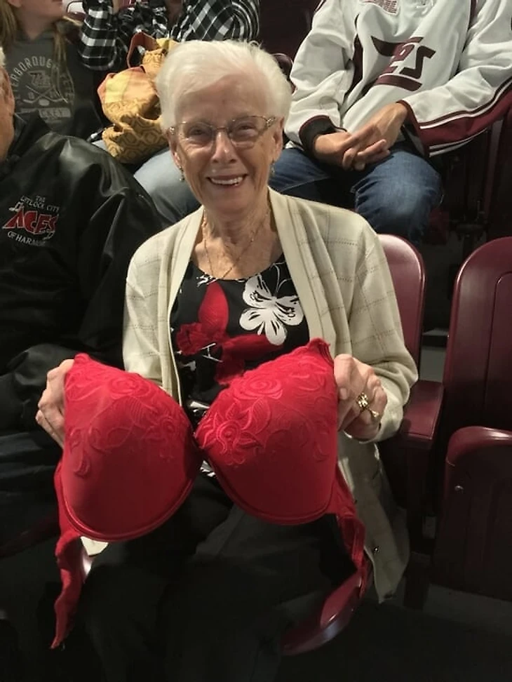 Она уже 25 лет ходила на матчи «Питс» и всегда занимала место в верхнем ряду у буфетов за воротами хозяев. И каждый раз, когда хозяева забрасывали шайбу, он вскакивала со своего места, размахивая над головой огромным лифчиком на виду у королевы, смотревшей на нее с портрета с другого конца арены.