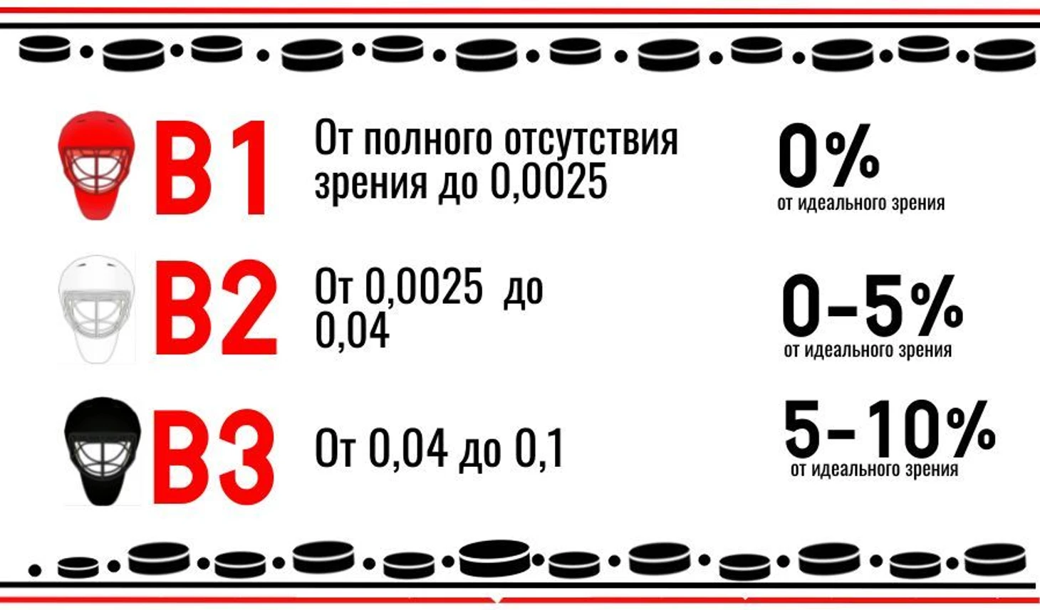 Каждый игрок в зависимости от остроты зрения имеет классификацию и «весит» от одного до трёх баллов. Чем зрение ниже, тем меньше баллов даётся за игрока. Во время игры класс хоккеиста определяется цветом шлема: B1 – красный, B2 – белый, B3 – чёрный. Вратарь всегда причисляется к классу B1, так как по правилам должен ничего не видеть.