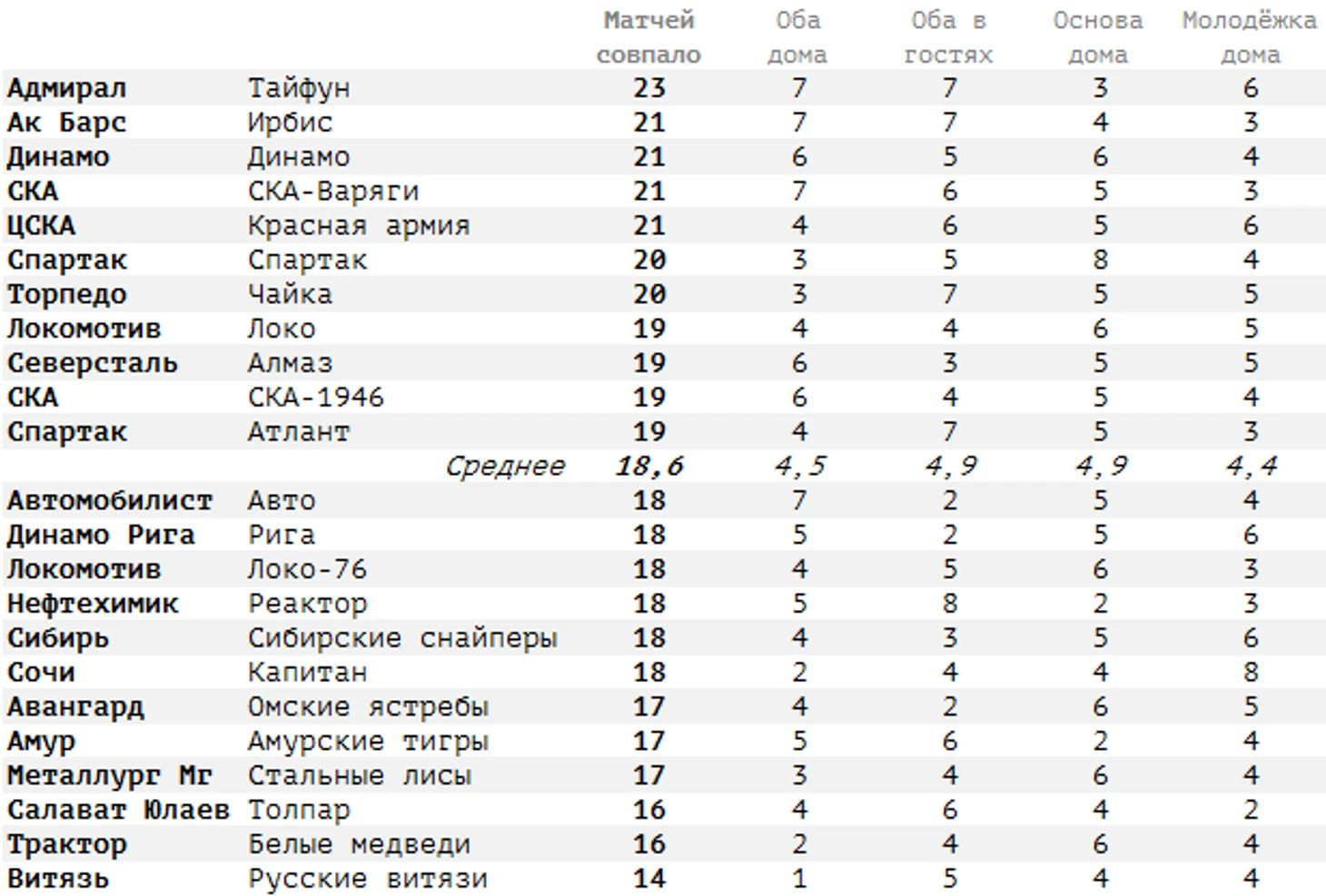 Оказывается, 18 совпавших матчей у «Сибири» и «Сибирских снайперов» — это норма. В том плане, что средний показатель 18,6. У кого-то чуть больше, у кого-то чуть меньше, но в целом треть матчей клуба КХЛ играется в один день с матчами команды МХЛ. Минимум у пары «Витязь» «Русские витязи» — 14 матчей и всего один раз придётся играть дома в один день. Максимум у «Адмирала» и «Тайфуна» — 23 раза играют в один день, из них 7 оба дома.