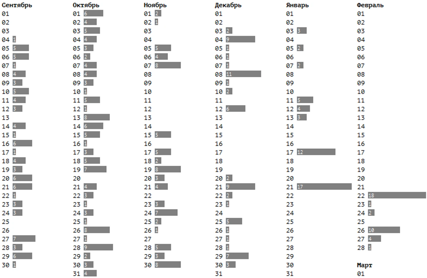 Пики совпадений — 17 и 18 молодёжек играют одновременно с основой — случаются непосредственно перед олимпийской паузой и сразу после неё. В эти дни и КХЛ, и МХЛ играют почти в полном составе.